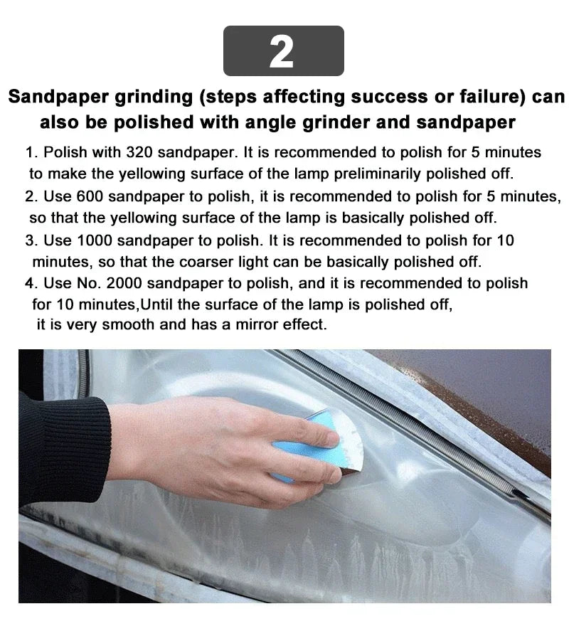 3, 【Fácil de usar】 El spray limpiador de faros es cómodo de usar. Simplemente lije primero con papel de lija grueso, rocíe con líquido de reparación y luego lije con papel de lija fino.